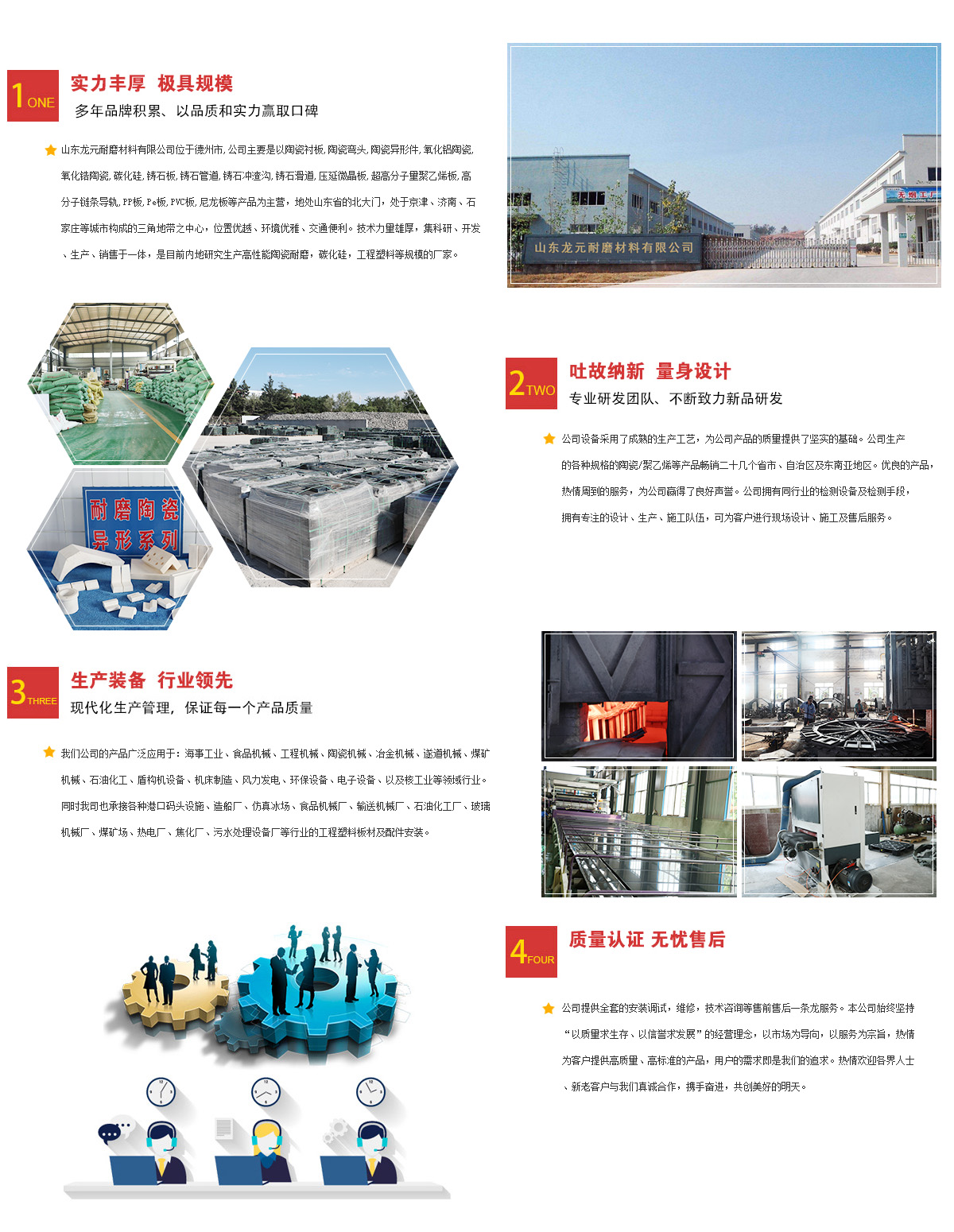 山東龍?jiān)湍ゲ牧嫌邢薰疚挥诘轮菔校局饕且?a href="/">鑄石板、氧化鋁陶瓷、三合一陶瓷復(fù)合襯板、陶瓷復(fù)合板、碳化硅、壓延微晶板、鑄石沖渣溝、氧化鋁陶瓷管道、氧化鋁陶瓷彎頭、三合一復(fù)合陶瓷板、鑄石管道、鑄石彎頭、氧化鋁陶瓷片、超高分子量聚乙烯板、三合一復(fù)合陶瓷板等產(chǎn)品為主營(yíng),地處山東省的北大門,處于京津、濟(jì)南、石家莊等城市構(gòu)成的三角地帶之中心,位置優(yōu)越、環(huán)境優(yōu)雅、交通便利。技術(shù)力量雄厚,集科研、開(kāi)發(fā)、生產(chǎn)、銷售于一體,是目前內(nèi)地研究生產(chǎn)高性能陶瓷耐磨,碳化硅,工程塑料等規(guī)模大的廠家之一。公司設(shè)備采用了成熟的生產(chǎn)工藝,為公司產(chǎn)品的質(zhì)量提供了堅(jiān)實(shí)的基礎(chǔ)。